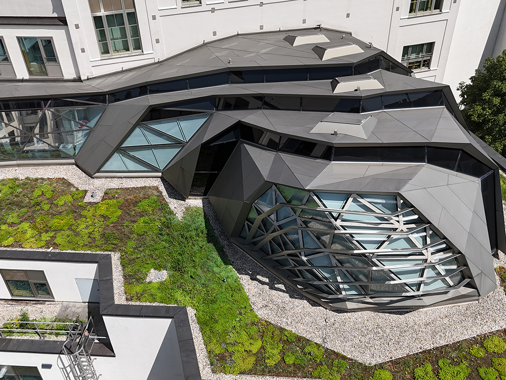Das Grundgerüst des neuen Orchesterprobensaals im oberen Bereich des Neubaus ist eine etwa 20 Tonnen schwere Stahlkonstruktion. Die Außenhülle besteht aus unterschiedlich großen Blech- und Glaselementen. Für die Verglasung in acht Metern Höhe kam die bewährte Heavydrive-Technik zum Einsatz. Der kompakte Montagekran MRK 86 mit Überkopfmanipulator VSGU 600 K hat eine Traglast von bis zu 2,8 Tonnen und eine Hakenhöhe von 8,6 Metern. Der leistungsstarke Kran ist einfach per Funkfernbedienung zu bedienen und eignet sich für den Innen- und Außeneinsatz.