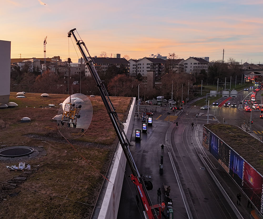 Das kuppelförmige Glas maß 3.254 Millimeter im Durchmesser und wiegt zwischen 550 und 600 Kilogramm. Die Arbeiten im Auftrag der Ziltener AG fanden auf dem Dach in exponierter Lage statt. Mit zunehmender Dämmerung verstärkten sich die Windverhältnisse, was eine besonders ruhige und präzise Steuerung der Hebebewegungen erforderte. Zum Einsatz kam hierbei die leistungsstarke Vakuumsauganlage VSG 600 KR SP 20.