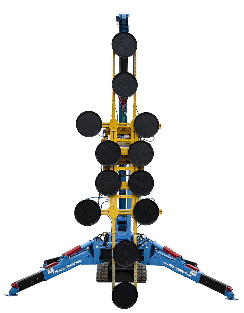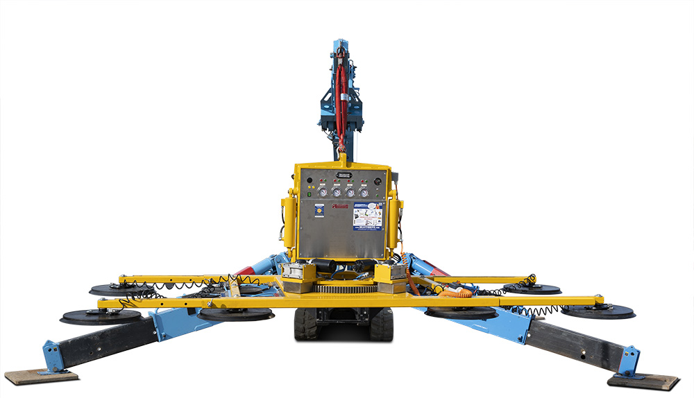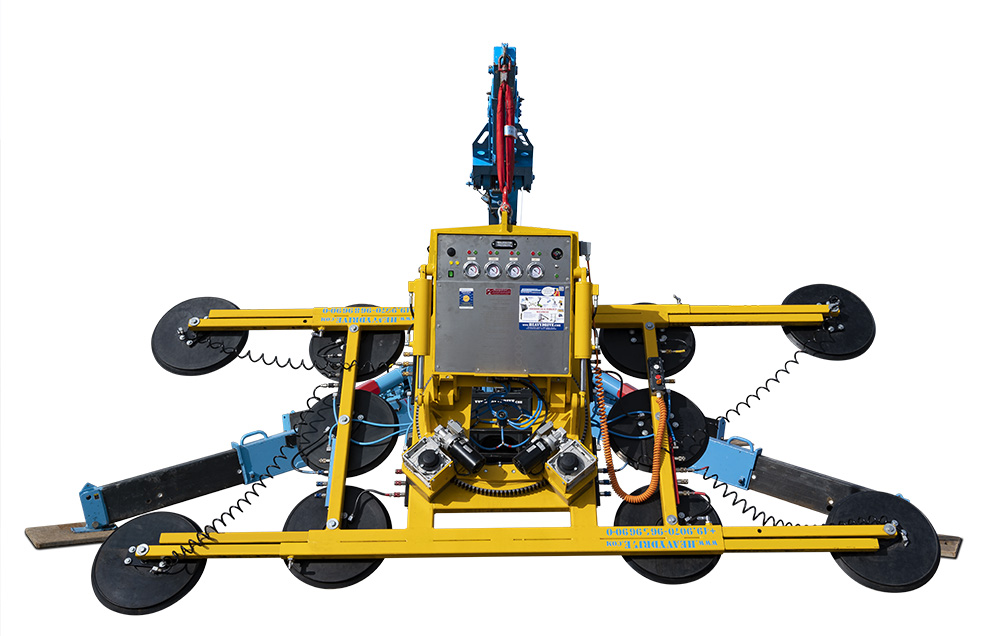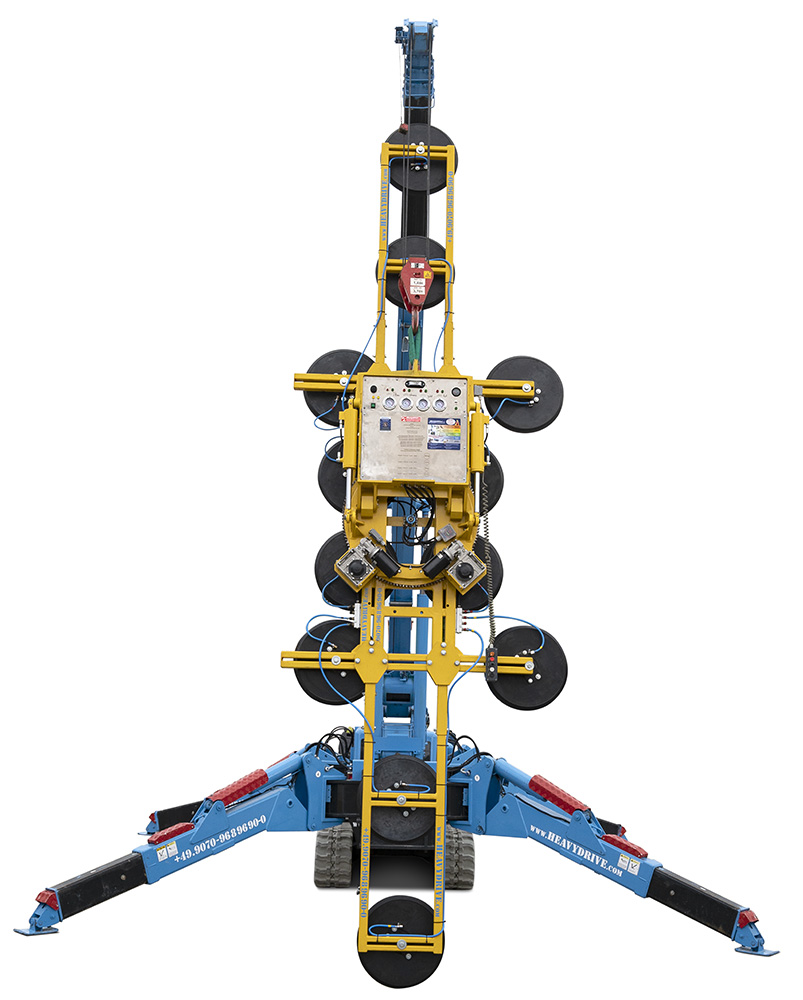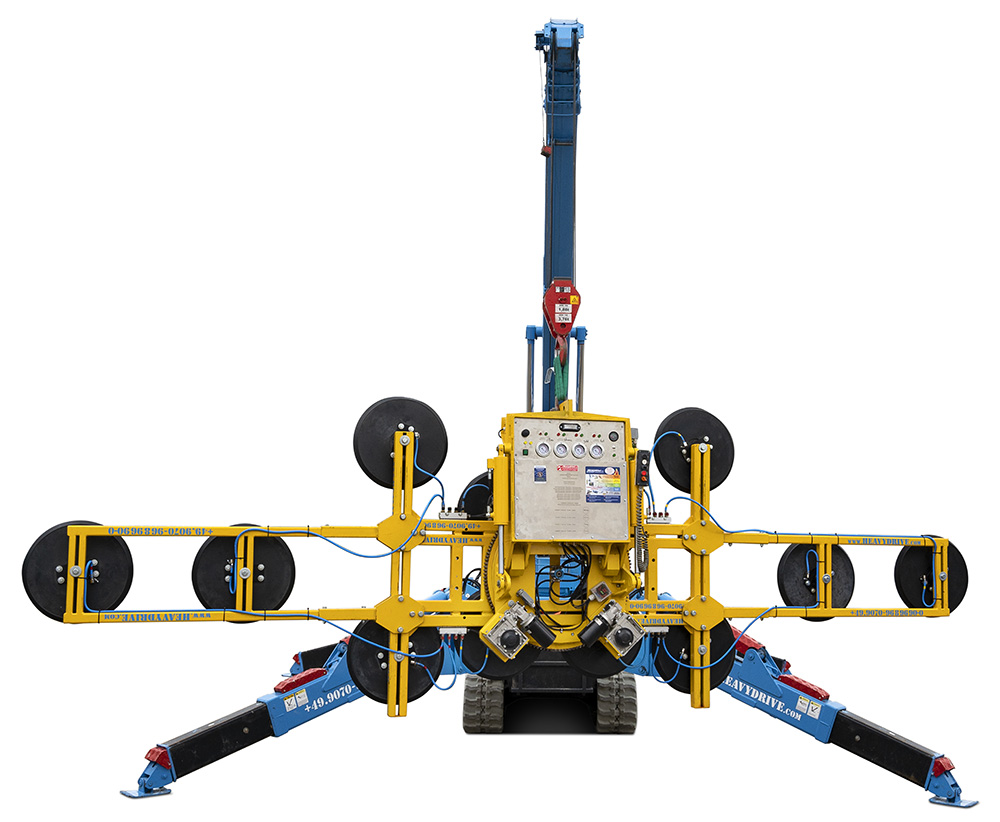 Die Vakuum-Sauganlage VSG 3500K ist dafür die perfekte Lösung: Die Anlage saugt Scheiben bis 8 Meter Länge und 4 Meter Breite an. Ganz einfach per Fernsteuerung können Glasscheiben oder Fassadenelemente bis zu 3,5 Tonnen vertikal gedreht und um 90 Grad flach abgelegt werden.